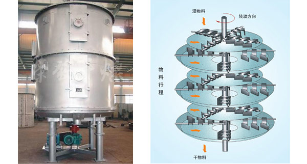 濕物料自加料器連續地加到干燥器上部第一層干燥盤上,帶有耙葉的耙臂作回轉運動使耙臂作回轉運動使耙葉連續地翻抄物料。物料沿指數螺旋線流過干燥盤表面,在小干燥盤上的物料被移送到外緣,并在外緣落到下方的大干燥盤外緣,在大干盤上物料向里移動并從中間落料口落如下一層小干燥盤中。大小干燥盤上下交替排列,物料得以連續地流過整個干燥器。中空的干燥盤內通入加熱介質,加熱介質形式有飽和蒸汽、熱水和導熱油,加熱介質由干燥盤的一端進入,從另一端導出。已干物料從^后一層干燥盤落到殼體的底層,^后被耙葉移送到出料口排出。濕份從物料中逸出,由設在頂蓋上的排濕口排出,真空型盤式干燥器的濕氣由設在頂蓋上的真空泵口排出。從底層排出的干物料可直接包裝。通過配加翅片加熱器、溶劑回收冷凝器、袋式除塵器、干料返混機構、引風機等輔機,可提高其干燥的生產能力,干燥膏糊狀和熱敏性物 料,可方便地回收溶劑,并能進行熱解和反應操作。