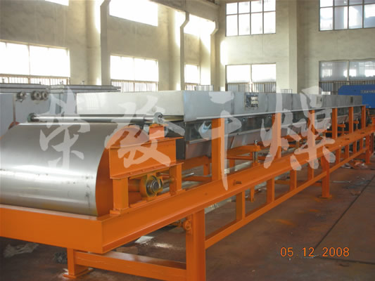 該機由液體變固體粒狀,主要是通過造粒模頭造粒,采用回轉式鋼帶連續進行,通過噴淋水冷卻定型。