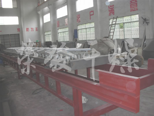 該機主要由落料模造粒成型機頭,冷卻輸送不銹鋼帶及帶輪、噴淋冷卻系統、傳動系統、保溫裝置、機架、刮刀等組成。落料模造粒機頭主要由機頭模套和機頭芯軸等組成。噴淋冷卻系統主要由噴頭、盛水池等組成。傳動系統主要由減速箱(減速器)調速電機等組成。