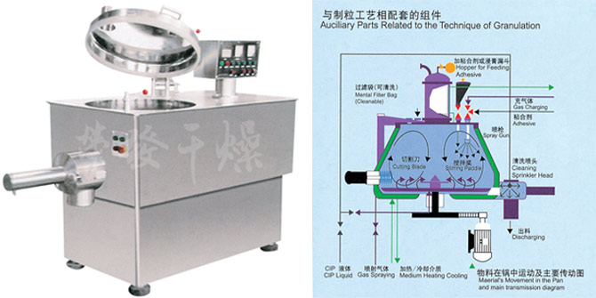 粉體物料與粘合劑在圓筒形容器中由底部混合漿充分混合成濕潤軟材,然后由側置的高速粉碎槳切割成均勻的濕顆粒。